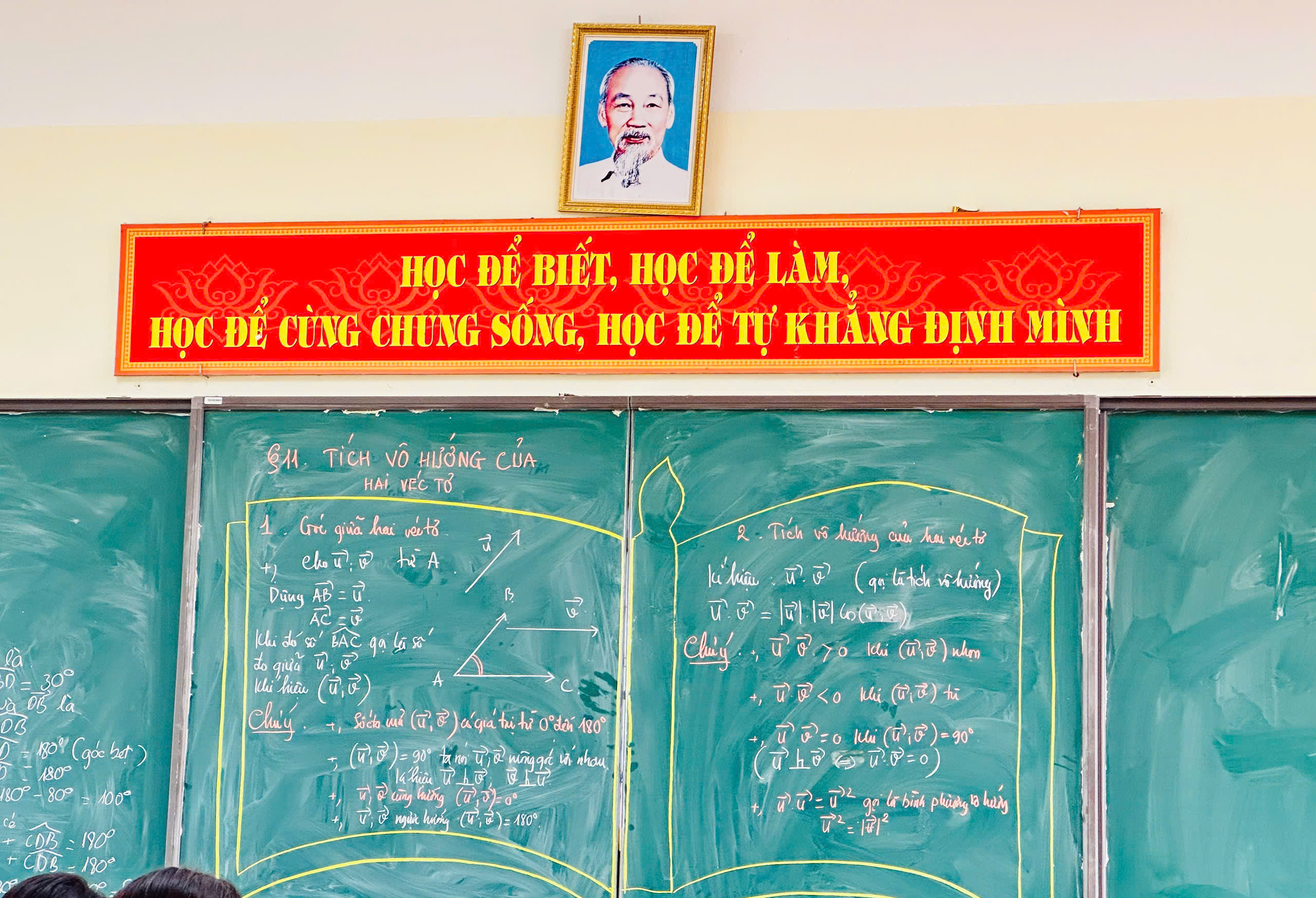 Tiếp nối là tiết thao giảng của thầy Trần Văn Đồng tại lớp 10C với bài “Tích vô hướng của hai véc tơ”. Bằng cách liên hệ kiến thức Toán học với Vật lí và các tình huống đời sống, thầy đã giúp học sinh nhận ra vai trò của Toán học trong việc xác định hướng, đo lường và mô tả các hiện tượng xung quanh. Qua đó, học sinh hiểu rằng Toán học không tách rời các môn học khác, mà là công cụ quan trọng giúp con người lý giải thế giới, ứng dụng trong kỹ thuật, xây dựng, sản xuất và nhiều lĩnh vực của đời sống hiện đại.